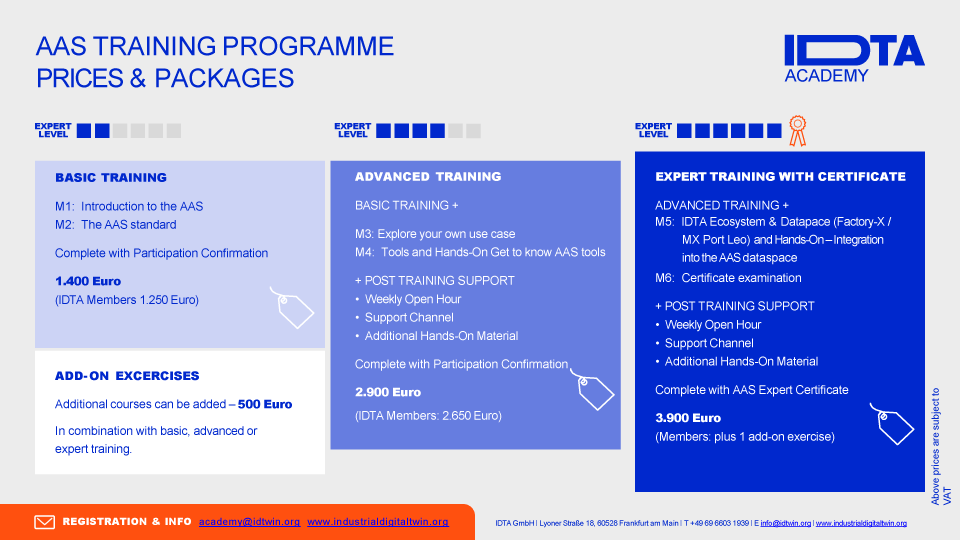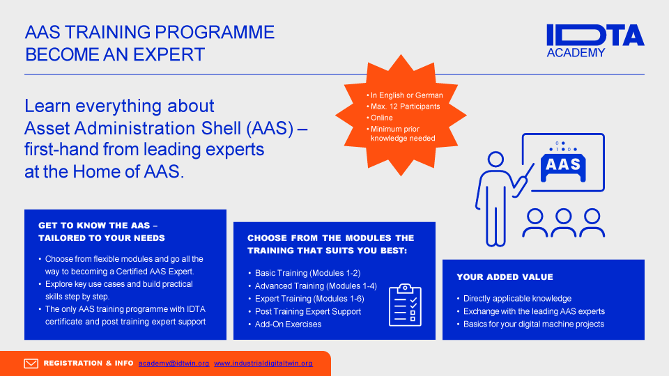 Das AAS- Trainingsprogramm unterstützt Unternehmen auf ihrem Weg zur digitalen Transformation mit der AAS. Es ist auf die realen Geschäftsanforderungen zugeschnitten und hilft Organisationen dabei, ihre Strategien mit dem Digital Twin zu stärken.